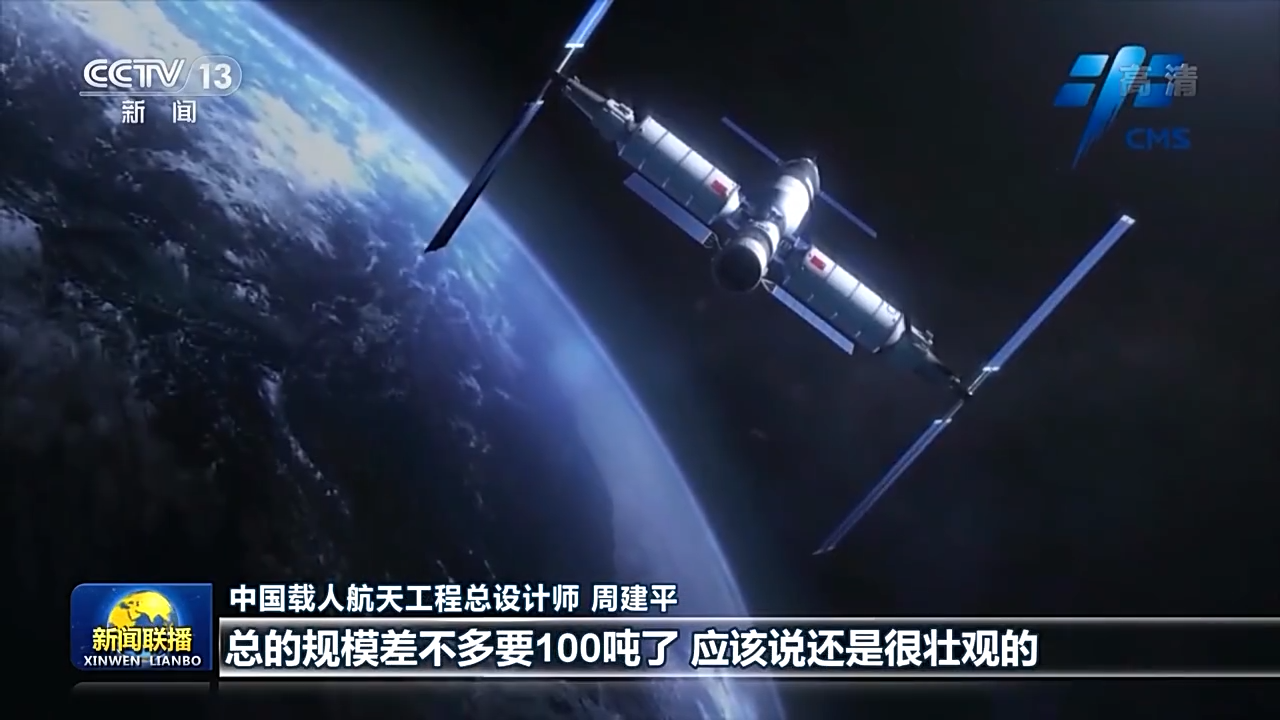 中國載人航天工程總設(shè)計師 周建平:總書記一直把航天強國建設(shè),作為實現(xiàn)中華民族偉大復興中的一個重要的組成部分。中國空間站最大構(gòu)型就是三艙三船,總的規(guī)模差不多要100噸,應該說還是很壯觀的。