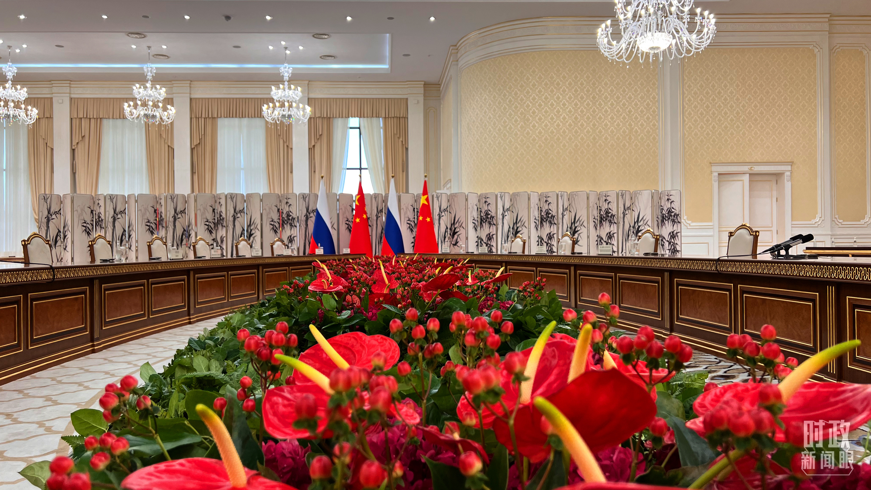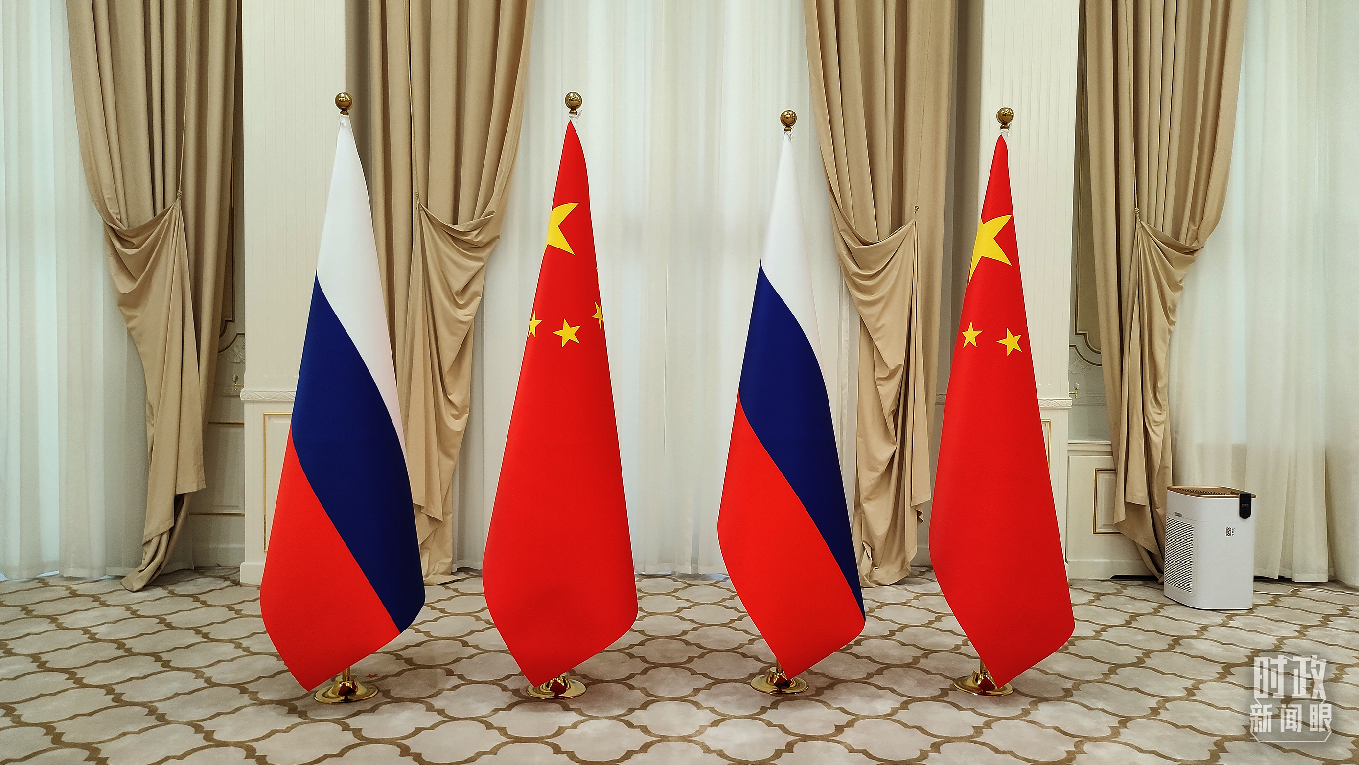 △中俄兩國(guó)元首會(huì)見現(xiàn)場(chǎng)擺放的兩國(guó)國(guó)旗。(總臺(tái)央視記者薛冠南拍攝)