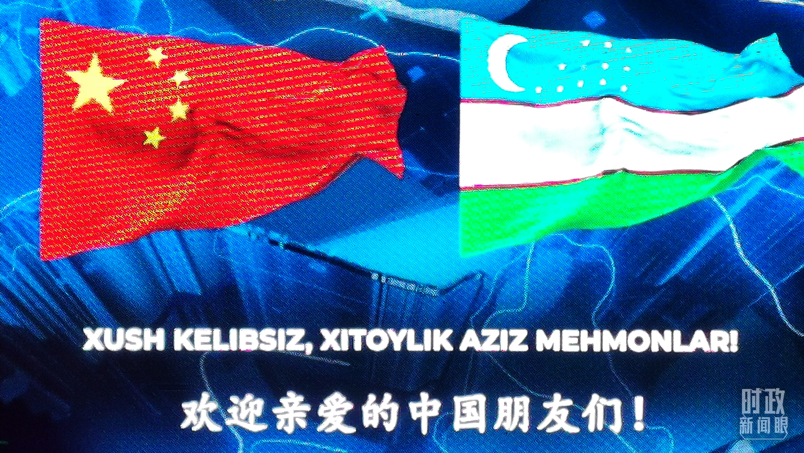 △在撒馬爾罕街道上,電子屏幕顯示中烏兩國(guó)國(guó)旗和中烏兩種語言的歡迎標(biāo)語。(總臺(tái)央視記者黃京輝拍攝)