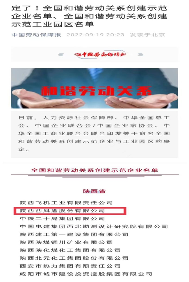 西部決策網(wǎng)訊(記者艾米杰 韓宗憲 通訊員 許凡 張?zhí)炝ⅲ闃?shù)立示范典型、弘揚(yáng)人文關(guān)懷、傳遞和諧溫暖,進(jìn)一步推動(dòng)廣大企業(yè)深入開(kāi)展和諧勞動(dòng)關(guān)系創(chuàng)建活動(dòng),促進(jìn)構(gòu)建中國(guó)特色和諧勞動(dòng)關(guān)系。近日,人力資源和社會(huì)保障部、中華全國(guó)總工會(huì)、中國(guó)企業(yè)聯(lián)合會(huì)/中國(guó)企業(yè)家協(xié)會(huì)、中華全國(guó)工商業(yè)聯(lián)合會(huì)聯(lián)合印發(fā)《關(guān)于命名全國(guó)和諧勞動(dòng)關(guān)系創(chuàng)建示范企業(yè)與工業(yè)園區(qū)的決定》,陜西西鳳酒股份有限公司榜上有名,榮獲“全國(guó)和諧勞動(dòng)關(guān)系創(chuàng)建示范企業(yè)”稱(chēng)號(hào)。