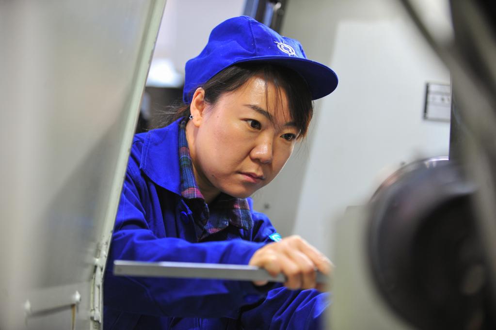 在中國(guó)兵器內(nèi)蒙古第一機(jī)械集團(tuán)有限公司第四分公司,趙晶為數(shù)控機(jī)床更換精加工所用的刀片(2018年3月5日攝)。新華社記者 彭源 攝
