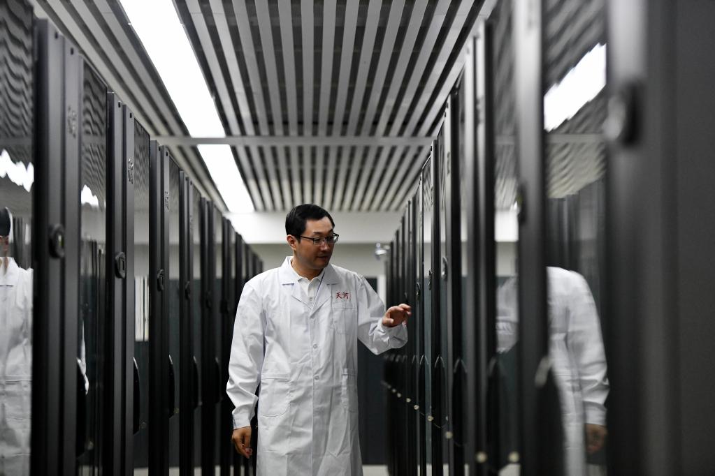 在國(guó)家超級(jí)計(jì)算天津中心“天河一號(hào)”機(jī)房?jī)?nèi),孟祥飛在查看設(shè)備運(yùn)行狀態(tài)(2021年5月27日攝)。新華社記者 趙子碩 攝