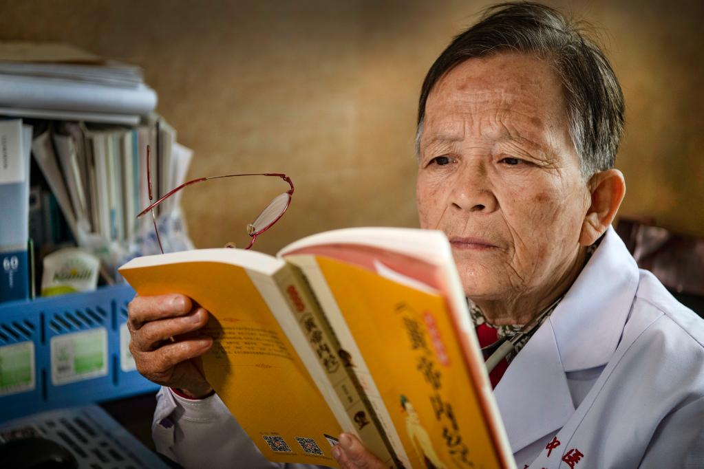 在陜西佳縣中醫(yī)院門(mén)診義診的路生梅,沒(méi)有病人時(shí)堅(jiān)持看書(shū)學(xué)習(xí)(2020年4月8日攝)。新華社記者 陶明 攝