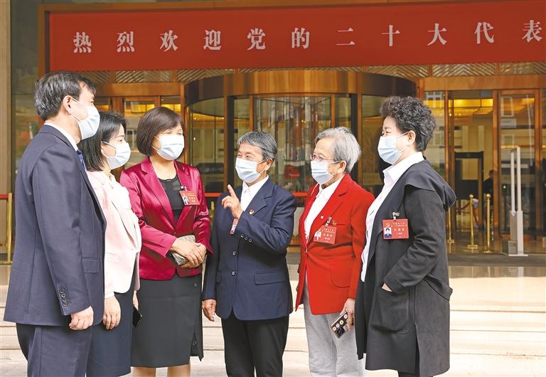 十月十四日,出席黨的二十大的陜西代表王友民、何菲、常亞瓊、張蓮蓮、路生梅、王照輝(左起)在住地交流履職感想。代表們一致表示,將堅(jiān)決扛起政治責(zé)任,以飽滿的熱情認(rèn)真履行好神圣職責(zé)。 記者 母家亮攝