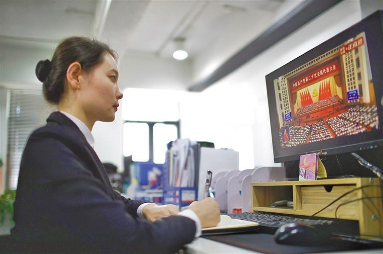 十月十六日,西安大唐不夜城景區(qū)工作人員龔飛飛在認(rèn)真收看黨的二十大開幕會(huì)。 記者 趙晨攝