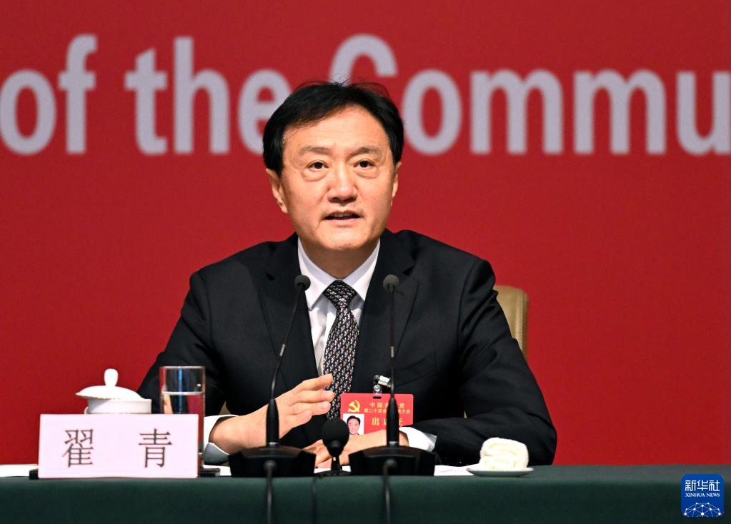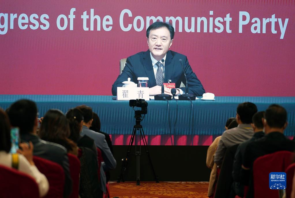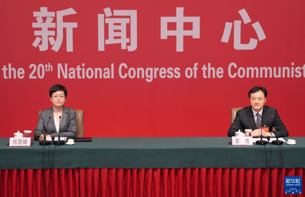 10月21日,中國共產黨第二十次全國代表大會新聞中心舉行記者招待會。生態(tài)環(huán)境部黨組成員、副部長翟青圍繞“建設人與自然和諧共生的美麗中國”主題與記者交流。新華社記者 宋彥樺 攝