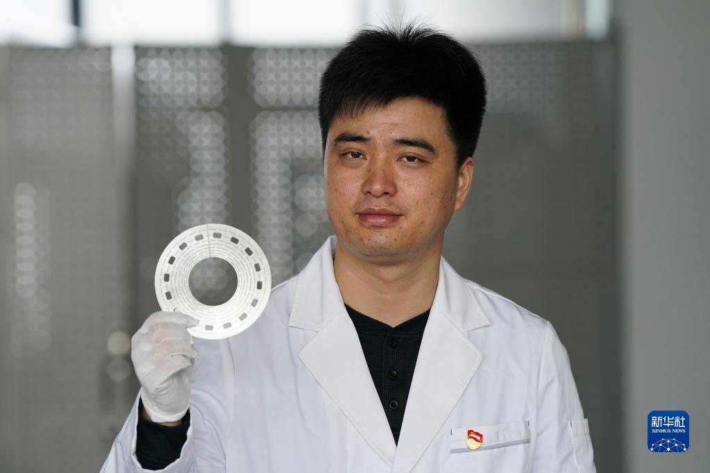 10月17日,在中國科學院合肥物質科學研究院強磁場科學中心,副研究員房震展示水冷磁體線圈的核心組件——比特片。新華社記者 杜宇 攝