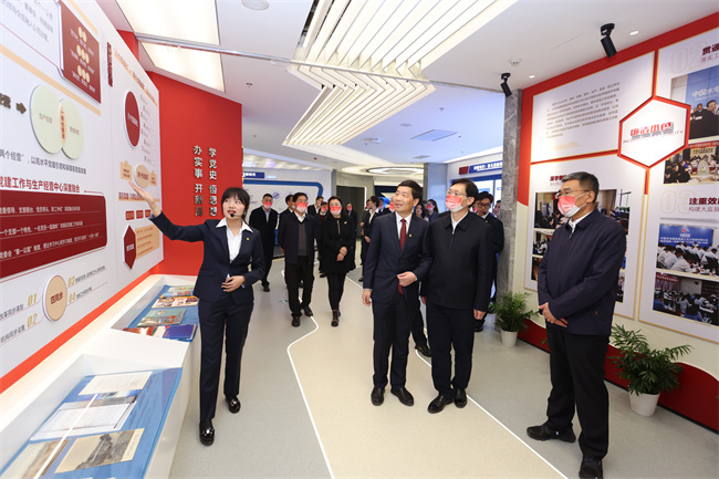梁向峰在企業(yè)展廳向西咸新區(qū)黨工委副書記、管委會主任姜建春介紹水電十五局近年黨建情況