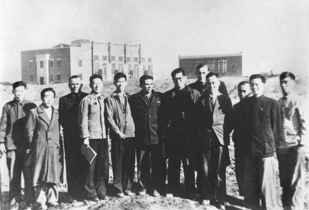 1956年,江澤民同志(左七)在長(zhǎng)春第一汽車制造廠同援建一汽的蘇聯(lián)專家等合影。新華社發(fā)