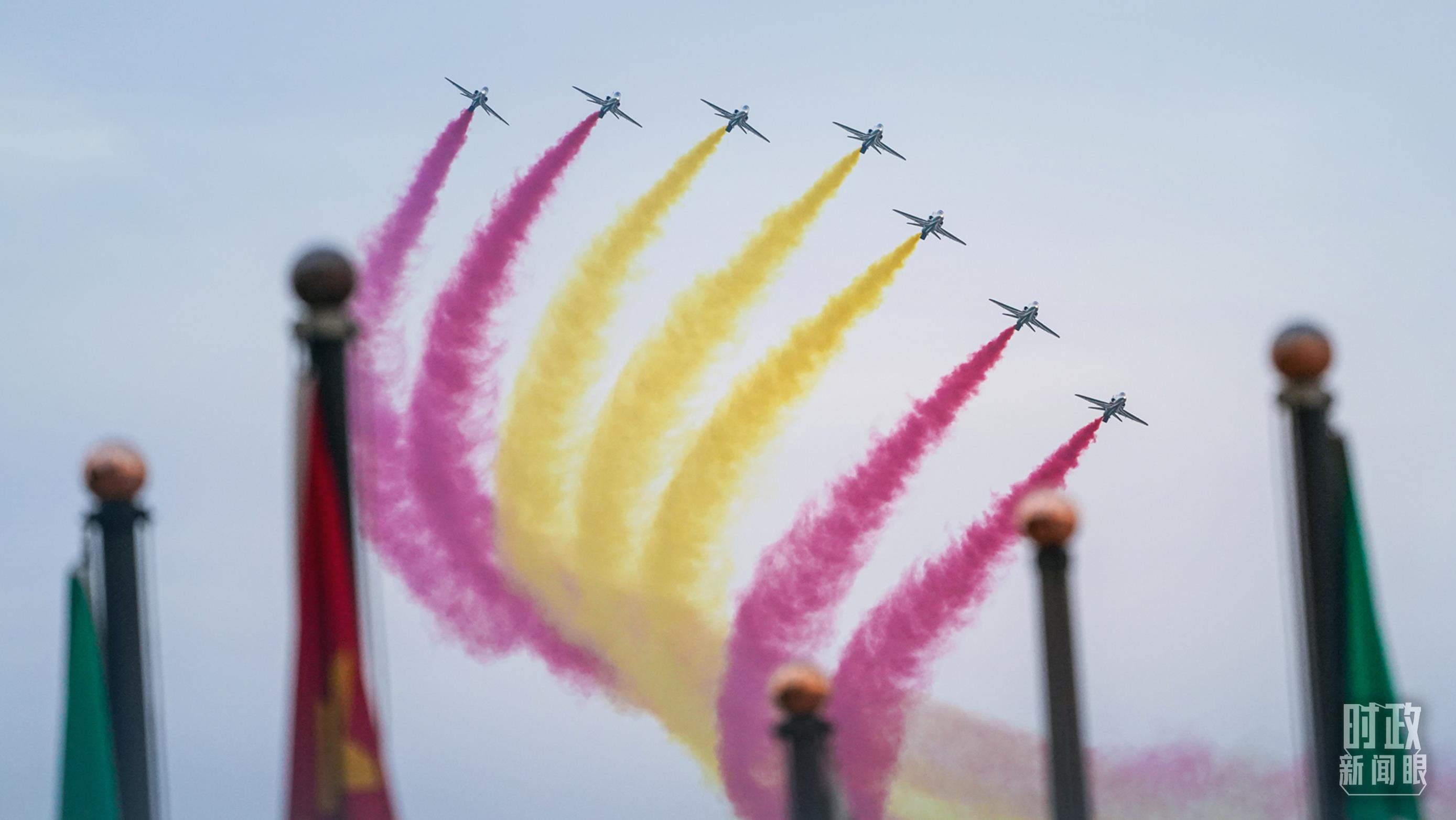 △沙特禮賓護(hù)衛(wèi)機(jī)在空中拉出象征中國國旗的紅黃兩色彩帶。(總臺國廣記者李晉拍攝)
