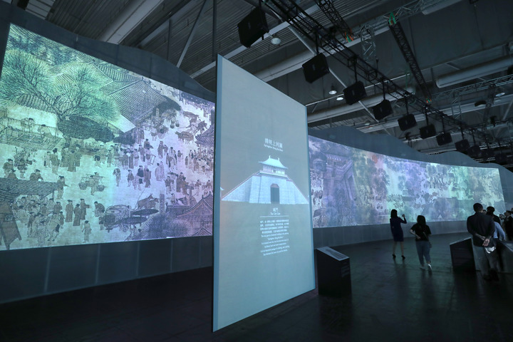 參觀者在香港亞洲國際博覽館內(nèi)觀看《清明上河圖3.0》數(shù)碼藝術(shù)香港展(2019年7月26日攝)。新華社記者 吳曉初 攝