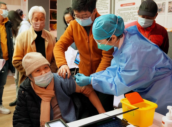 12月9日,在上海市黃浦區(qū)打浦橋街道大同居委會(huì),接種小分隊(duì)的護(hù)士在為老年人接種新冠疫苗。新華社記者 劉穎 攝