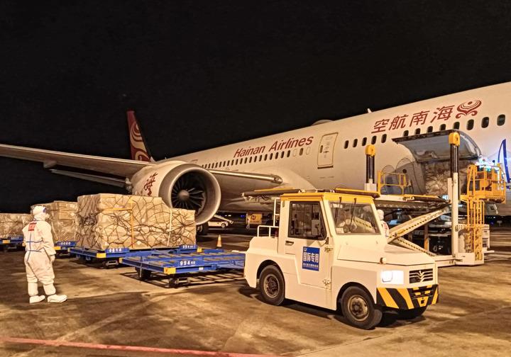 11月24日,海口美蘭國(guó)際機(jī)場(chǎng)的工作人員在停機(jī)坪裝運(yùn)貨物。次日凌晨,???mdash;法蘭克??透呢浂ㄆ谥揠H航線正式恢復(fù)。新華社發(fā)