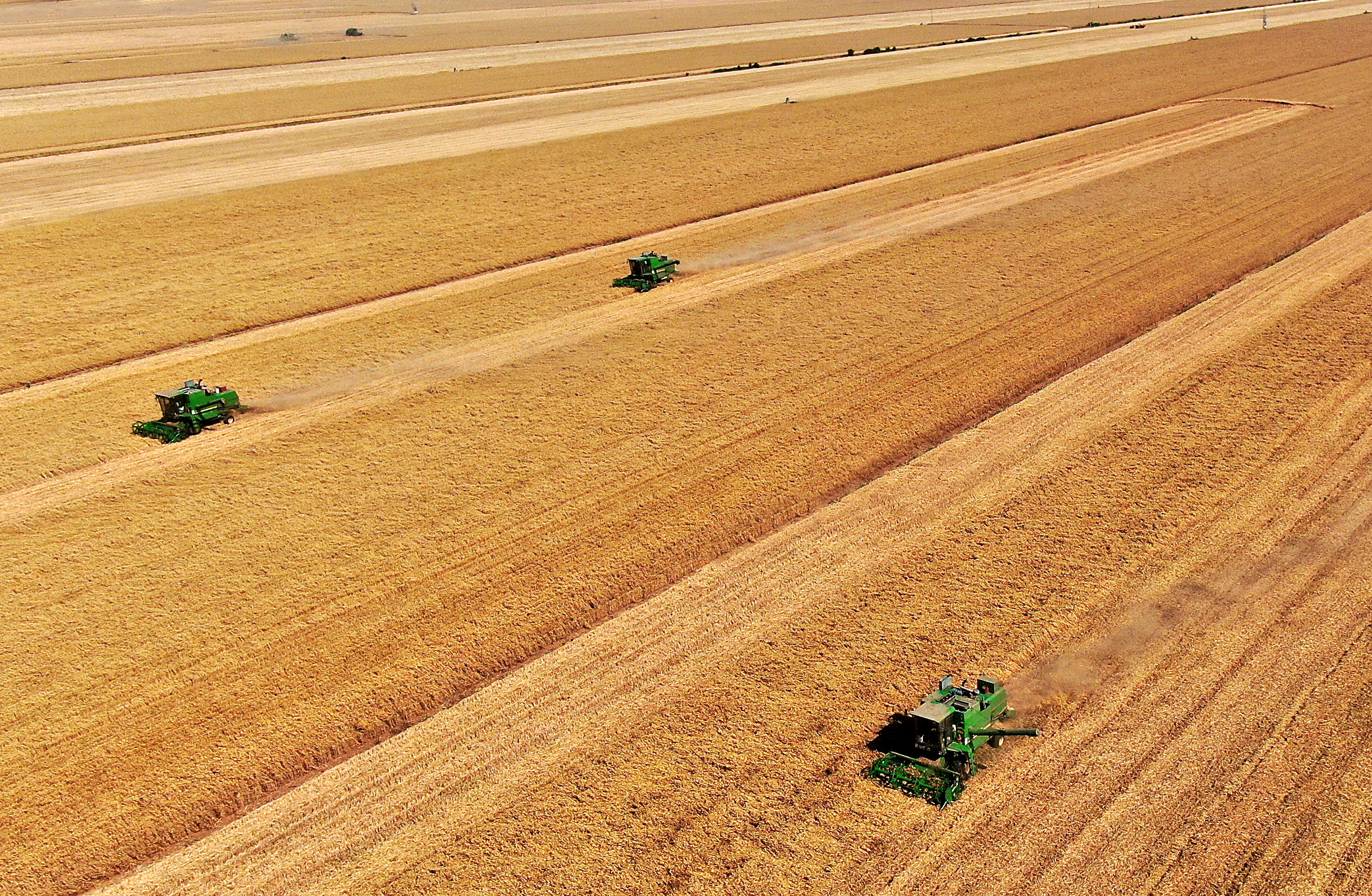 在河南省黃泛區(qū)農(nóng)場(chǎng)九分場(chǎng)的麥田里,農(nóng)機(jī)手操作收割機(jī)收獲小麥(2021年6月6日攝,無(wú)人機(jī)照片)。新華社記者 李安 攝