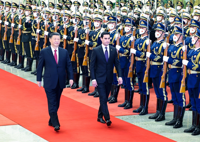 會(huì)談前,習(xí)近平在人民大會(huì)堂北大廳為謝爾達(dá)爾·別爾德穆哈梅多夫舉行歡迎儀式。