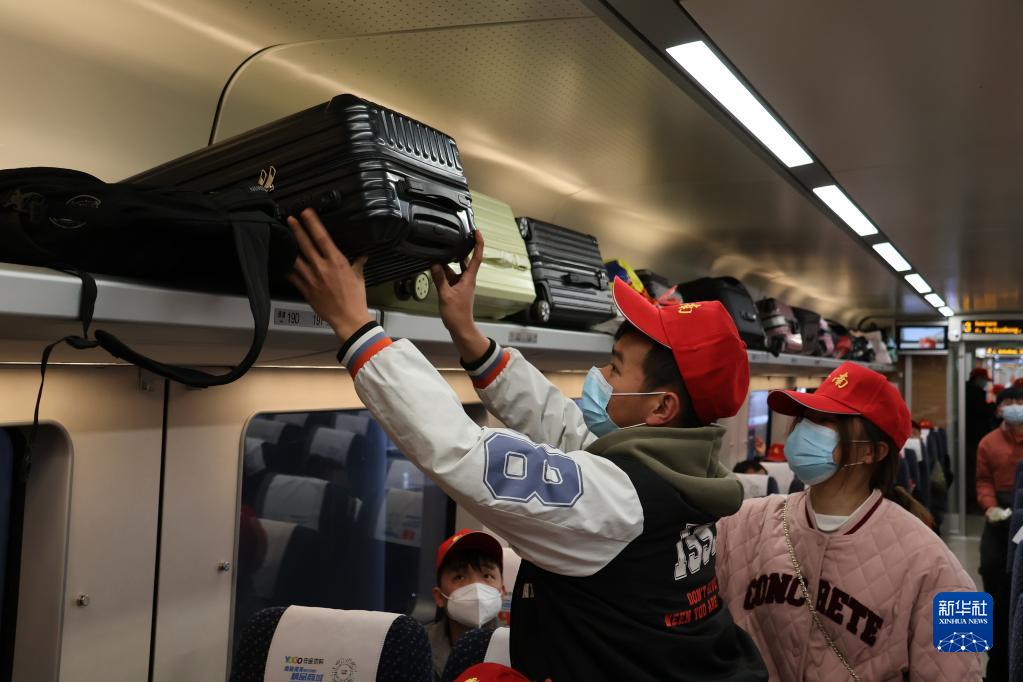 1月30日,旅客在D2879次務(wù)工專(zhuān)列上放行李。這是2023年貴陽(yáng)開(kāi)出的首趟高鐵務(wù)工專(zhuān)列。新華社記者 劉續(xù) 攝