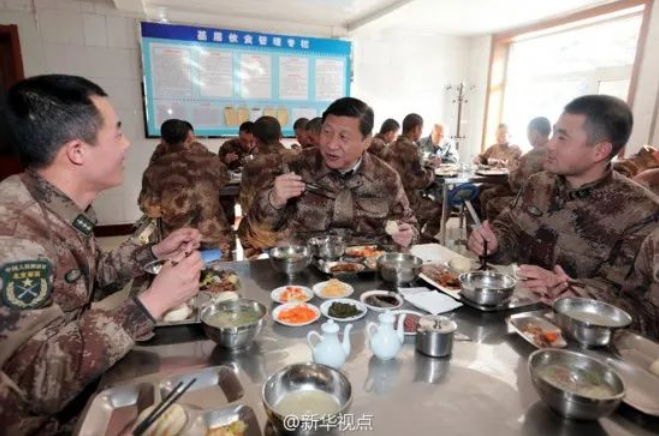2014年1月26日,習(xí)近平來到內(nèi)蒙古軍區(qū)邊防某團一連食堂,同戰(zhàn)士們一起用餐。(圖源:新華社)