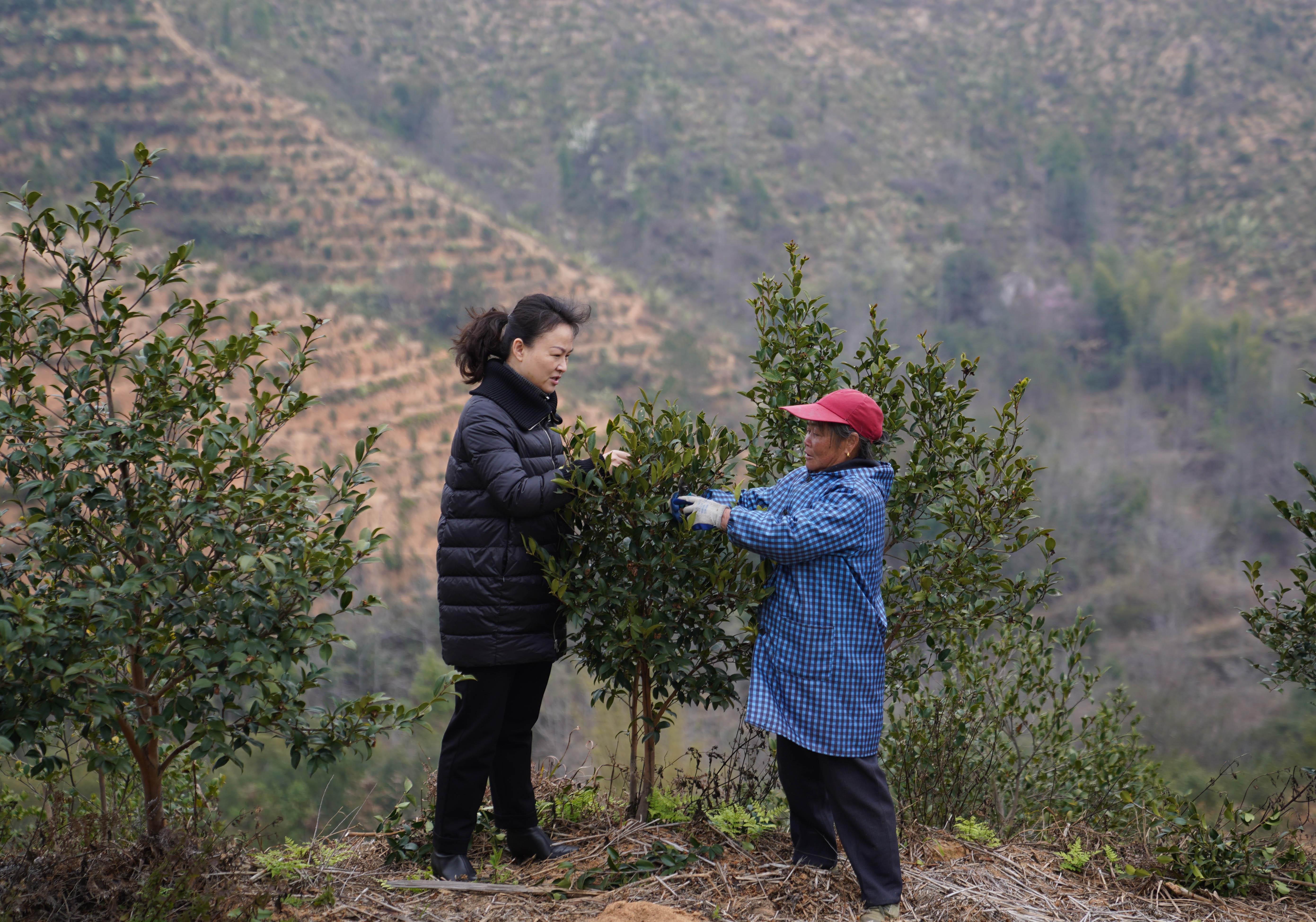2月24日,明經華(左)在江西贛州市經開區(qū)湖邊鎮(zhèn)蛤湖村白石下油茶基地調研油茶產業(yè)。新華社記者 周密 攝