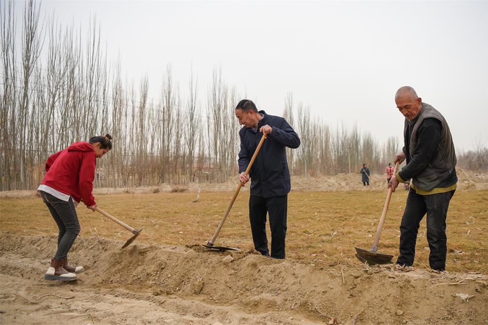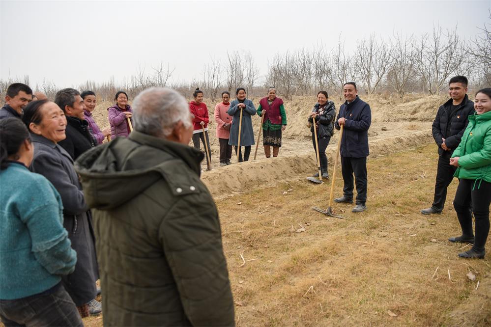 2月20日,在新疆和田地區(qū)策勒縣巴什玉吉買(mǎi)村,買(mǎi)買(mǎi)提依布熱依木·買(mǎi)買(mǎi)提明(中)和村民一起整理土地,為春耕生產(chǎn)做準(zhǔn)備。新華社記者 丁磊 攝