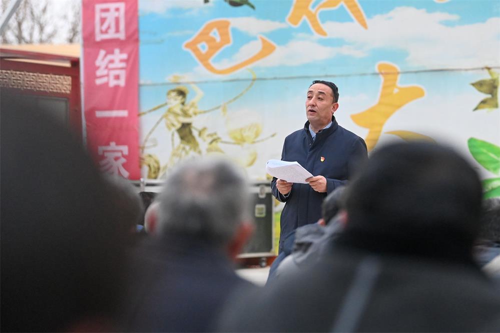 2月20日,在新疆和田地區(qū)策勒縣巴什玉吉買(mǎi)村村委會(huì),買(mǎi)買(mǎi)提依布熱依木·買(mǎi)買(mǎi)提明在升旗儀式后為村民宣講惠民政策。新華社記者 丁磊 攝