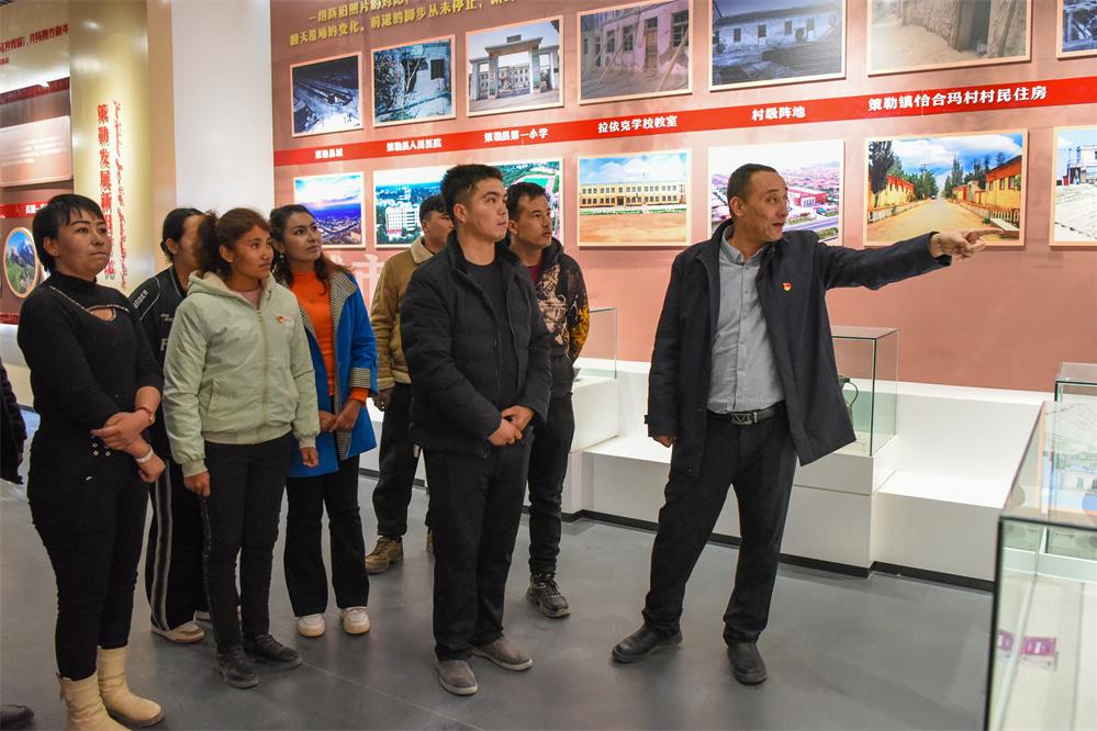 2月20日,在新疆和田地區(qū)策勒縣巴什玉吉買(mǎi)村的民族團(tuán)結(jié)館,買(mǎi)買(mǎi)提依布熱依木·買(mǎi)買(mǎi)提明(右一)向村里的年輕人介紹策勒縣的變化。新華社記者 丁磊 攝