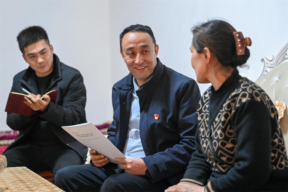2月20日,新疆和田地區(qū)策勒縣巴什玉吉買(mǎi)村黨支部書(shū)記買(mǎi)買(mǎi)提依布熱依木·買(mǎi)買(mǎi)提明(中)在村民家走訪(fǎng)。新華社記者 丁磊 攝