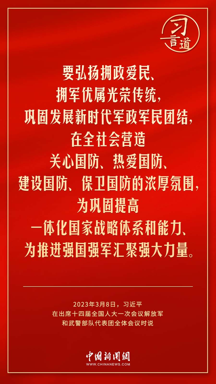 中共中央總書記、國家主席、中央軍委主席習(xí)近平8日下午在出席十四屆全國人大一次會(huì)議解放軍和武警部隊(duì)代表團(tuán)全體會(huì)議時(shí)說——