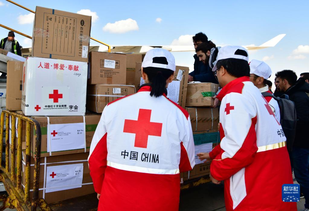 工作人員在敘利亞大馬士革國際機(jī)場卸載中國紅十字會援助的人道主義物資(2023年2月13日攝)。新華社發(fā)(阿馬爾·薩法爾賈拉尼攝)
