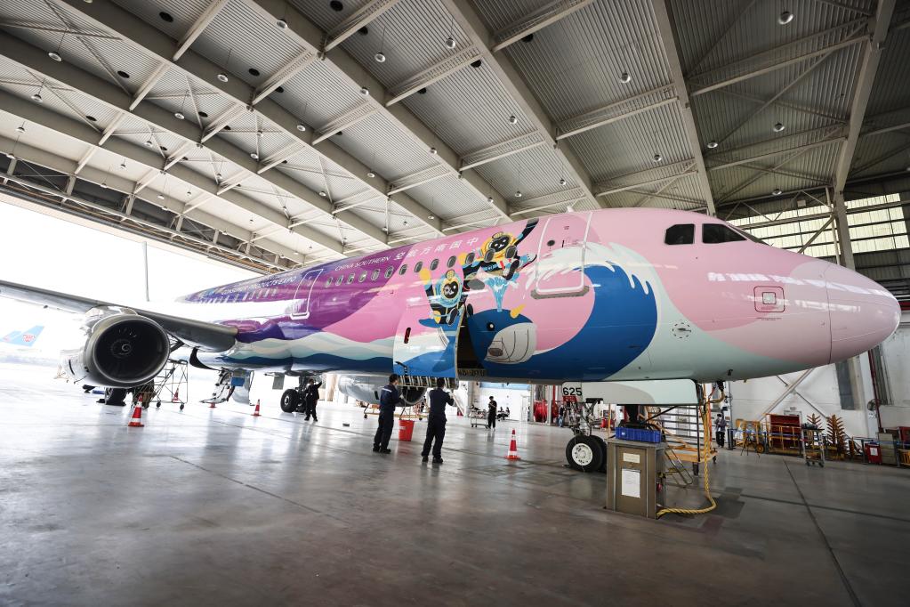 2023年3月7日,在??诿捞m國際機場,南航機務(wù)人員對“消博號”彩繪飛機進行深度檢查。新華社記者 張麗蕓 攝
