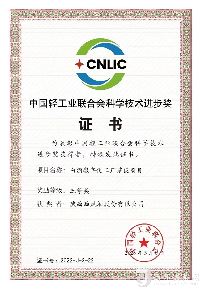 西部決策網(wǎng)訊(記者劉玉 韓宗憲 通訊員吳婷蘭 馬迪)近日,中國輕工業(yè)聯(lián)合會(huì)五屆三次、中華全國手工業(yè)合作總社八屆三次理事會(huì)在福建廈門召開。會(huì)議宣讀了《2022年度中國輕工聯(lián)合會(huì)科技獎(jiǎng)決定》并舉行了頒獎(jiǎng)儀式,陜西西鳳酒股份有限公司申報(bào)的“白酒數(shù)字化工廠建設(shè)項(xiàng)目”榮獲科學(xué)技術(shù)進(jìn)步三等獎(jiǎng)。