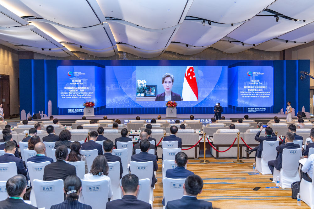 2023年4月20日,在重慶市第五屆中新(重慶)戰(zhàn)略性互聯(lián)互通示范項(xiàng)目金融峰會(huì)開(kāi)幕式現(xiàn)場(chǎng),新加坡通訊及新聞部部長(zhǎng)、內(nèi)政部第二部長(zhǎng)楊莉明線上致辭。新華社記者 黃偉 攝