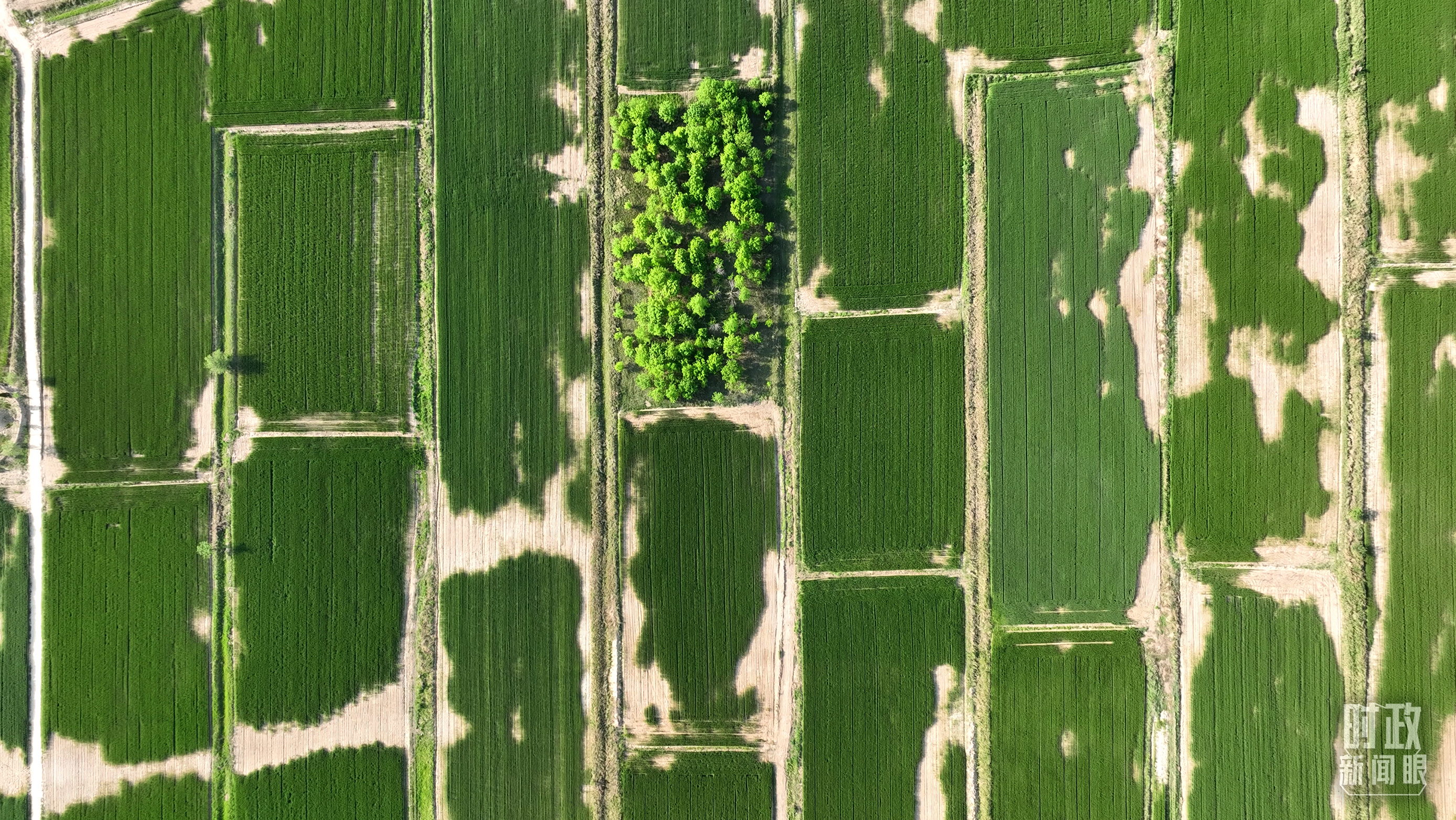 △旱堿麥田被分割成整齊劃一的綠色方塊。(總臺記者郭永良拍攝)