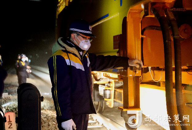 深夜,在柳家臺至古浪區(qū)間的兩臺線路搗固車發(fā)出震耳的轟鳴聲,打破了周圍的寂靜,搗固單元強(qiáng)有力的下插到道床深處。作業(yè)車輛的燈光點(diǎn)綴著夜空,黃色,紅色的燈光交織相錯,猶如一副深夜壯麗施工圖。在車下負(fù)責(zé)監(jiān)控的操作人員李偉一會握緊拳頭,一會揮動手臂和車內(nèi)操作人員進(jìn)行聯(lián)控操作,確保搗固單元準(zhǔn)確無誤的密實(shí)道床,提高線路道床的穩(wěn)定性。