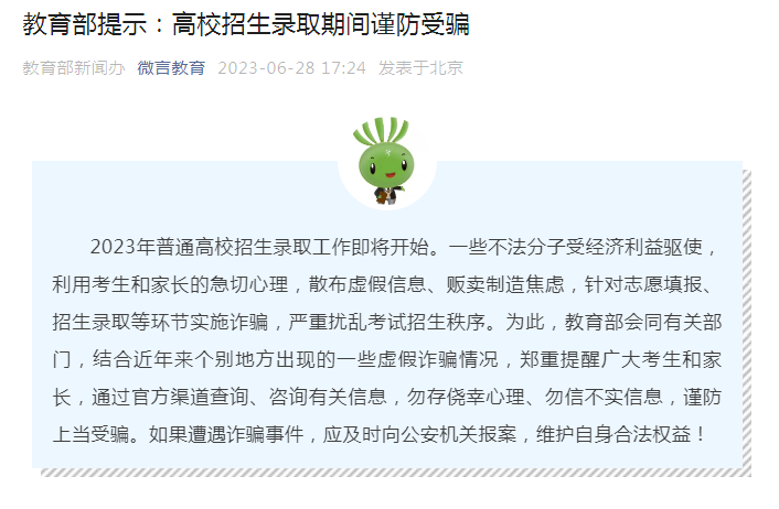 為此,教育部會同有關部門深入實施2023高考護航行動,開展“點亮權威考試招生機構官網標識”專項行動,已協(xié)調有關互聯(lián)網平臺對省級招生考試機構和高校的官方網站、微信公眾號等進行了權威標識,便于廣大考生和家長識別,獲取正規(guī)的招生政策和服務信息。此外,每年具有招生資格的全國高等學校名單都會在教育部官方網站發(fā)布。考生和家長可通過教育部官方網站“文獻”欄目下的“全國高等學校名單查詢”進行查詢核實。