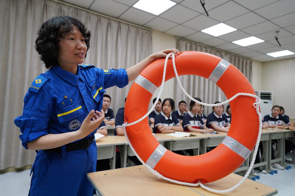 河北邢臺藍天救援隊志愿者指導(dǎo)邢臺市第八中學(xué)學(xué)生使用救生圈。 新華社記者駱學(xué)峰 攝