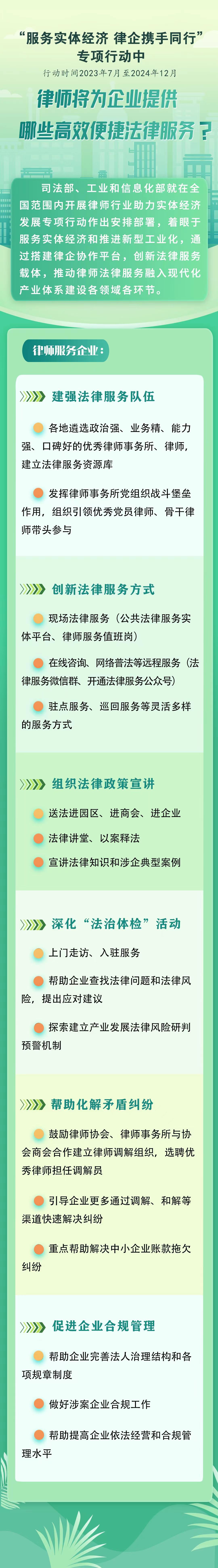 方案要求,各地司法行政部門、工業(yè)和信息化主管部門、通信管理局和律師協(xié)會要共同組織優(yōu)秀律師事務所和律師,為工業(yè)和信息化領域相關(guān)企業(yè)提供全業(yè)務、全時空、高效便捷的法律服務?;顒又校甯黝惼髽I(yè)法律服務需求,建強法律服務隊伍,創(chuàng)新法律服務方式,通過開展法律政策宣講、深化“法治體檢”活動等形式,推動律師行業(yè)服務實體經(jīng)濟的廣度和深度不斷拓展,服務的專業(yè)性、精準性、便捷性、實效性不斷增強,幫助企業(yè)化解法律風險,解決法律問題,維護合法權(quán)益,提升依法合規(guī)經(jīng)營管理水平。