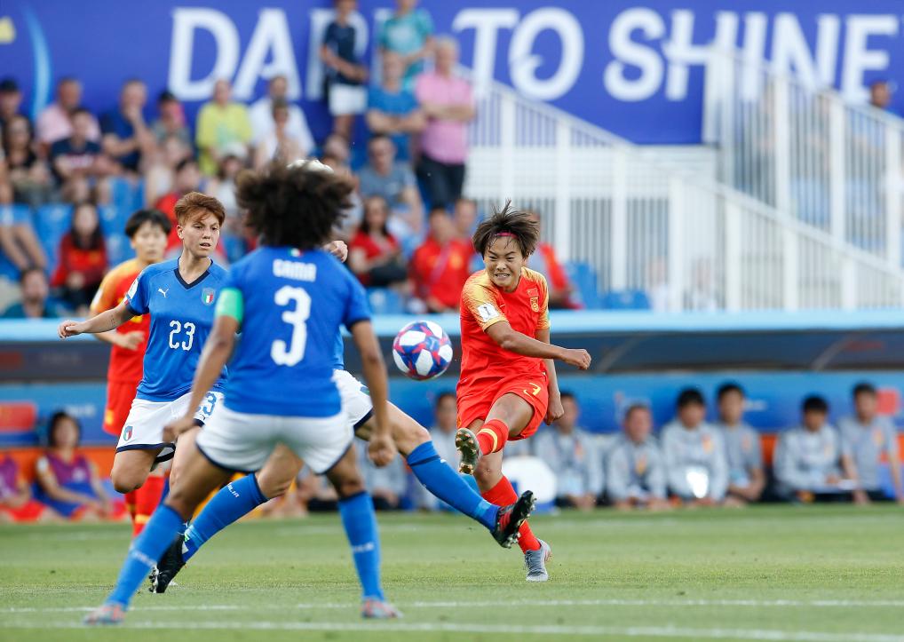 2019年6月25日,中國隊(duì)球員王霜(右一)在比賽中射門。當(dāng)日,在法國蒙彼利埃舉行的2019年國際足聯(lián)女足世界杯16強(qiáng)賽比賽中,中國隊(duì)以0比2不敵意大利隊(duì),無緣八強(qiáng)。新華社記者丁旭攝