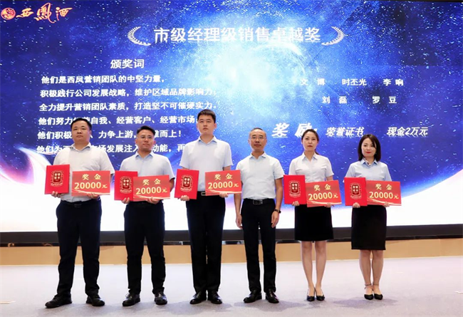 西鳳股份公司總經(jīng)理助理趙永紅為市級經(jīng)理銷售卓越獎獲得者頒發(fā)榮譽(yù)證書與獎金