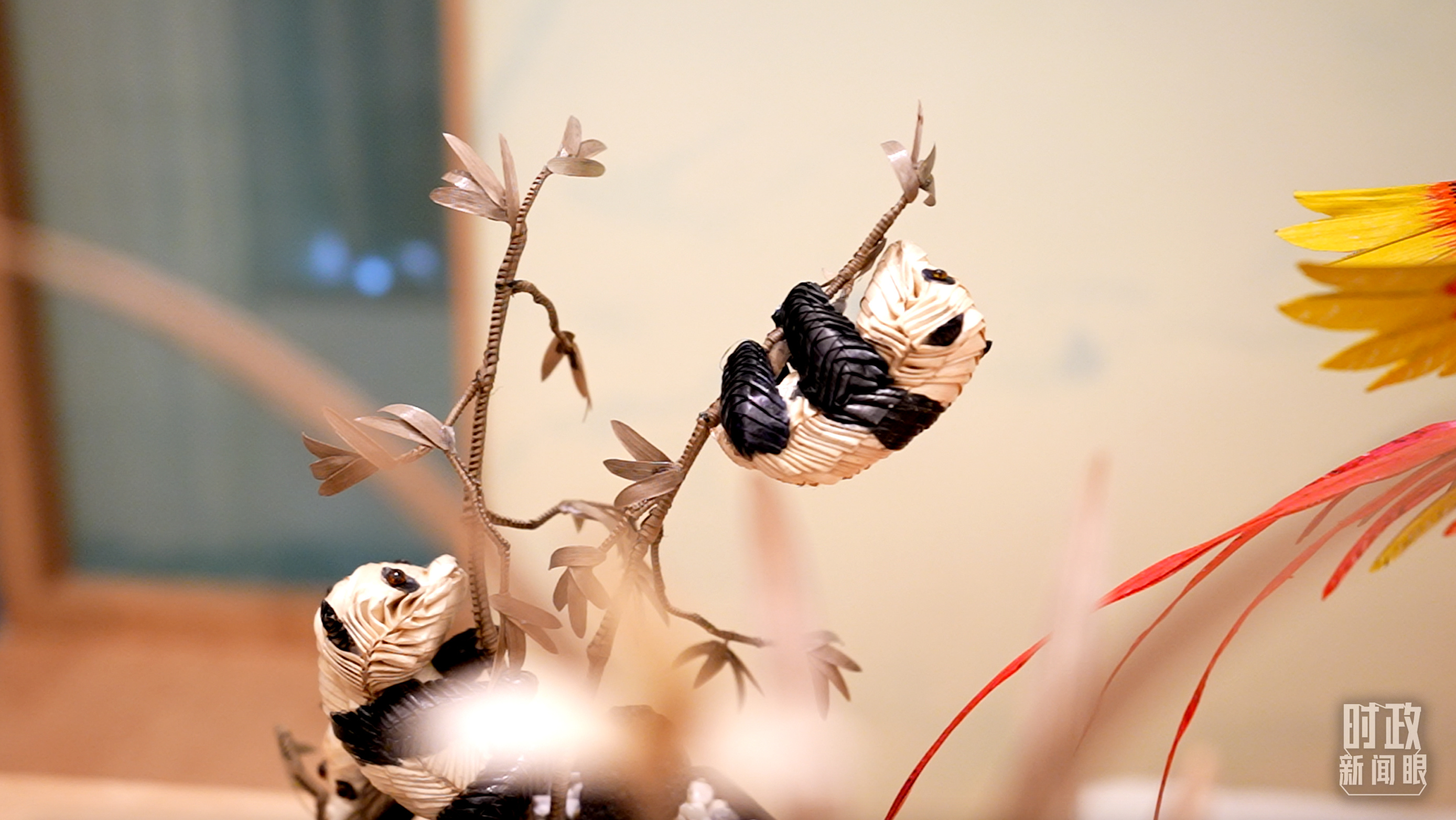 △為國(guó)際貴賓展示的四川非物質(zhì)文化遺產(chǎn)棕編和蜀繡。(總臺(tái)央視記者蔣碩、韓銳拍攝)