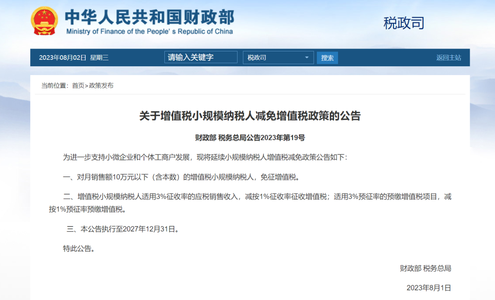 關(guān)于增值稅小規(guī)模納稅人減免增值稅政策的公告