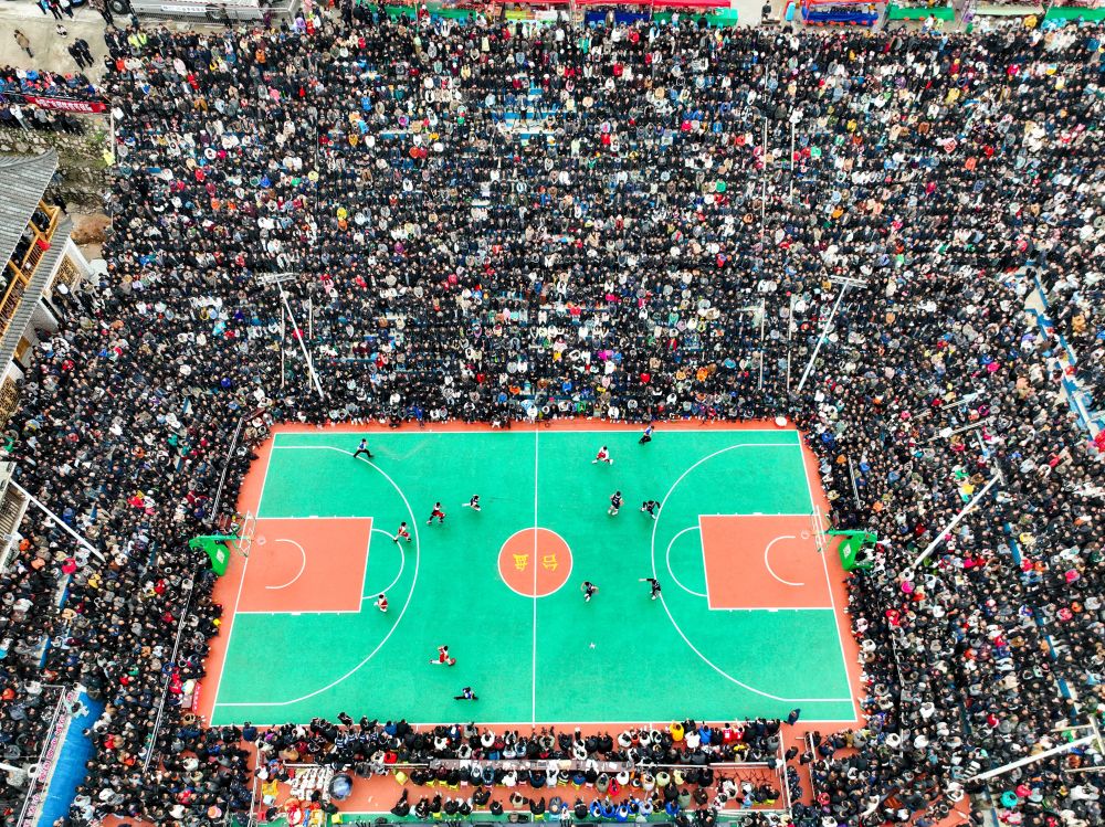 這是2023年3月27日在黔東南州臺(tái)江縣臺(tái)盤村拍攝的貴州省首屆“美麗鄉(xiāng)村”籃球聯(lián)賽總決賽比賽現(xiàn)場(chǎng)(無(wú)人機(jī)照片)。新華社記者 歐東衢 攝