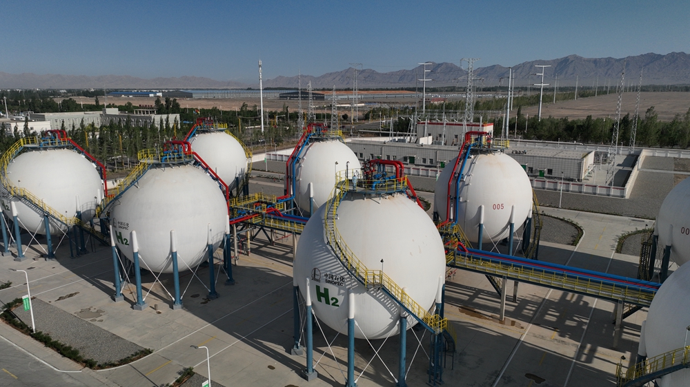 這是2023年6月30日拍攝的中國(guó)石化新疆庫(kù)車綠氫示范項(xiàng)目制氫廠儲(chǔ)氫罐區(qū)(無(wú)人機(jī)照片)。新華社記者 顧煜 攝