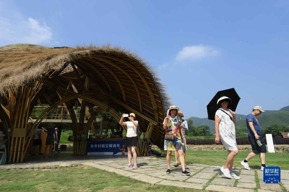 8月11日,游客在安吉余村參觀用當(dāng)?shù)厥a(chǎn)的竹材料建造的建筑。