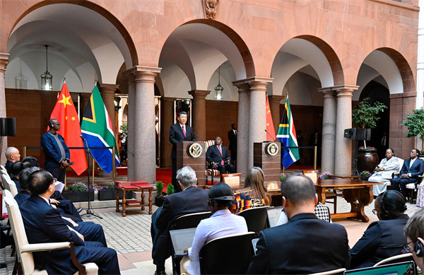 當(dāng)前,中國(guó)共產(chǎn)黨正團(tuán)結(jié)帶領(lǐng)中國(guó)人民以中國(guó)式現(xiàn)代化全面推進(jìn)中華民族偉大復(fù)興,南非也在積極自主探索符合本國(guó)國(guó)情的發(fā)展道路。中南關(guān)系面臨新的發(fā)展機(jī)遇。剛才,我同拉馬福薩總統(tǒng)舉行了富有成果的會(huì)談,就新時(shí)代兩國(guó)關(guān)系發(fā)展以及共同關(guān)心的國(guó)際和地區(qū)問(wèn)題交換了意見(jiàn),達(dá)成重要共識(shí)。我們見(jiàn)證了一系列重要雙邊合作文件簽署。我對(duì)兩國(guó)友好合作關(guān)系前景充滿信心。