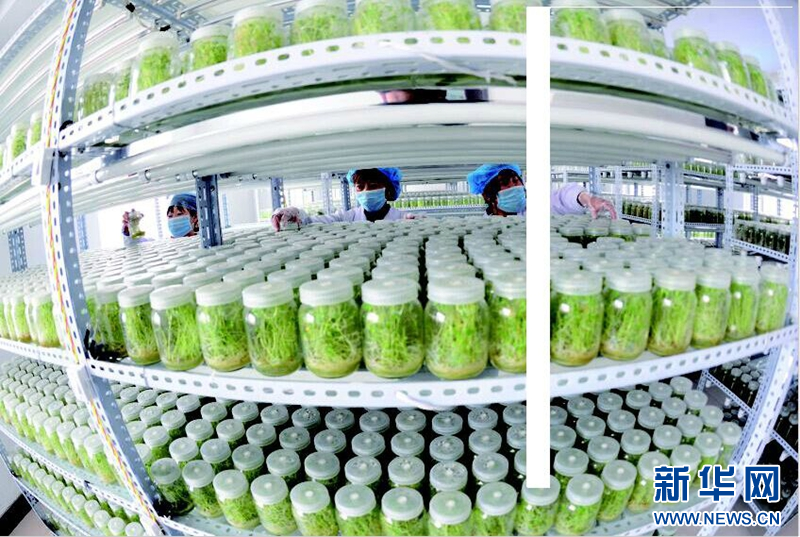 在康農(nóng)薯業(yè)有限公司里,一株株小拇指長短的青苗生機勃勃。技術(shù)人員輕捏滴管,將脫毒制劑滴入培養(yǎng)皿中,觀測記錄馬鈴薯脫毒種苗的生長情況。