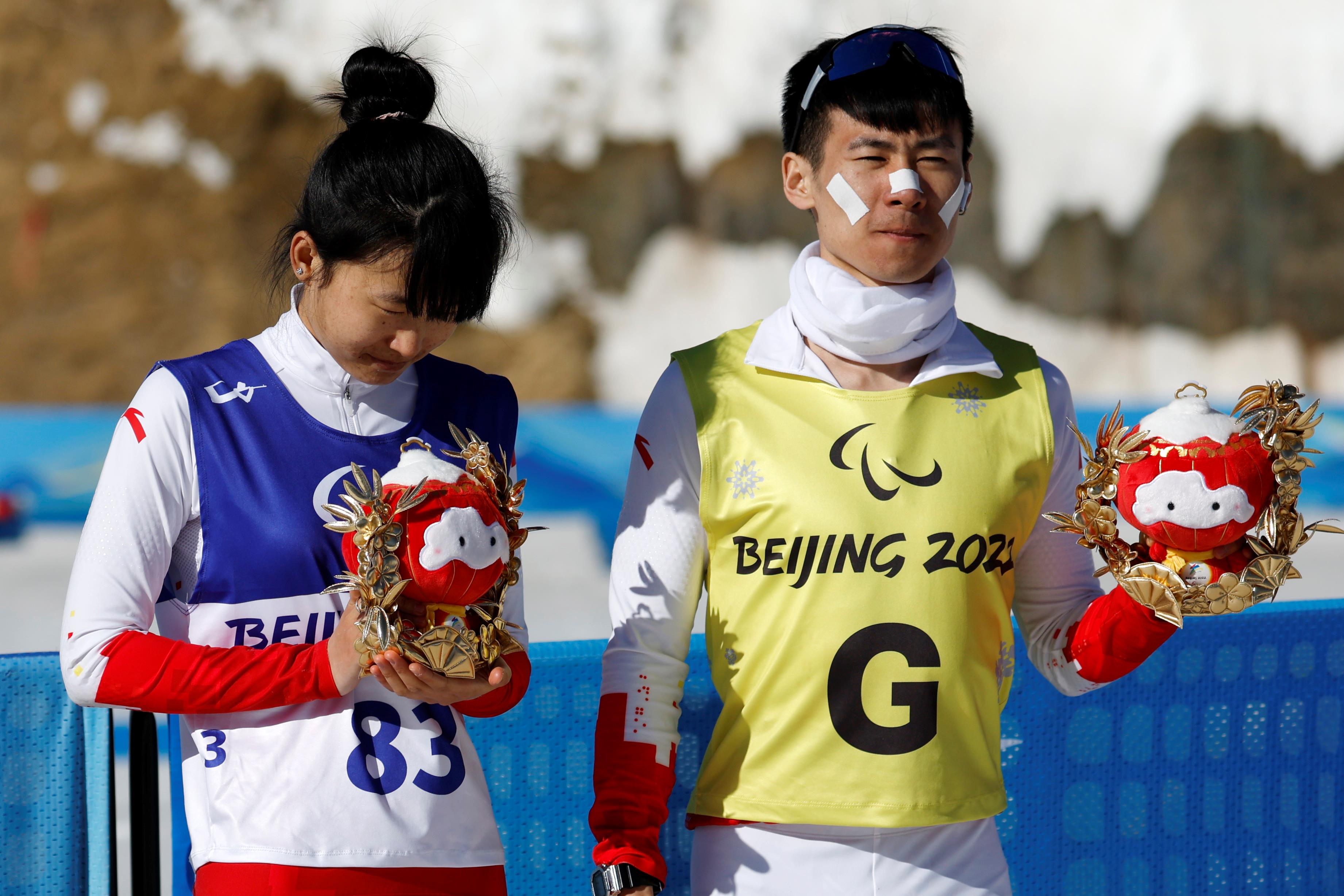 △2022年3月8日,2022冬殘奧會殘奧冬季兩項(xiàng)女子中距離(視障)比賽中,中國選手王躍獲季軍。