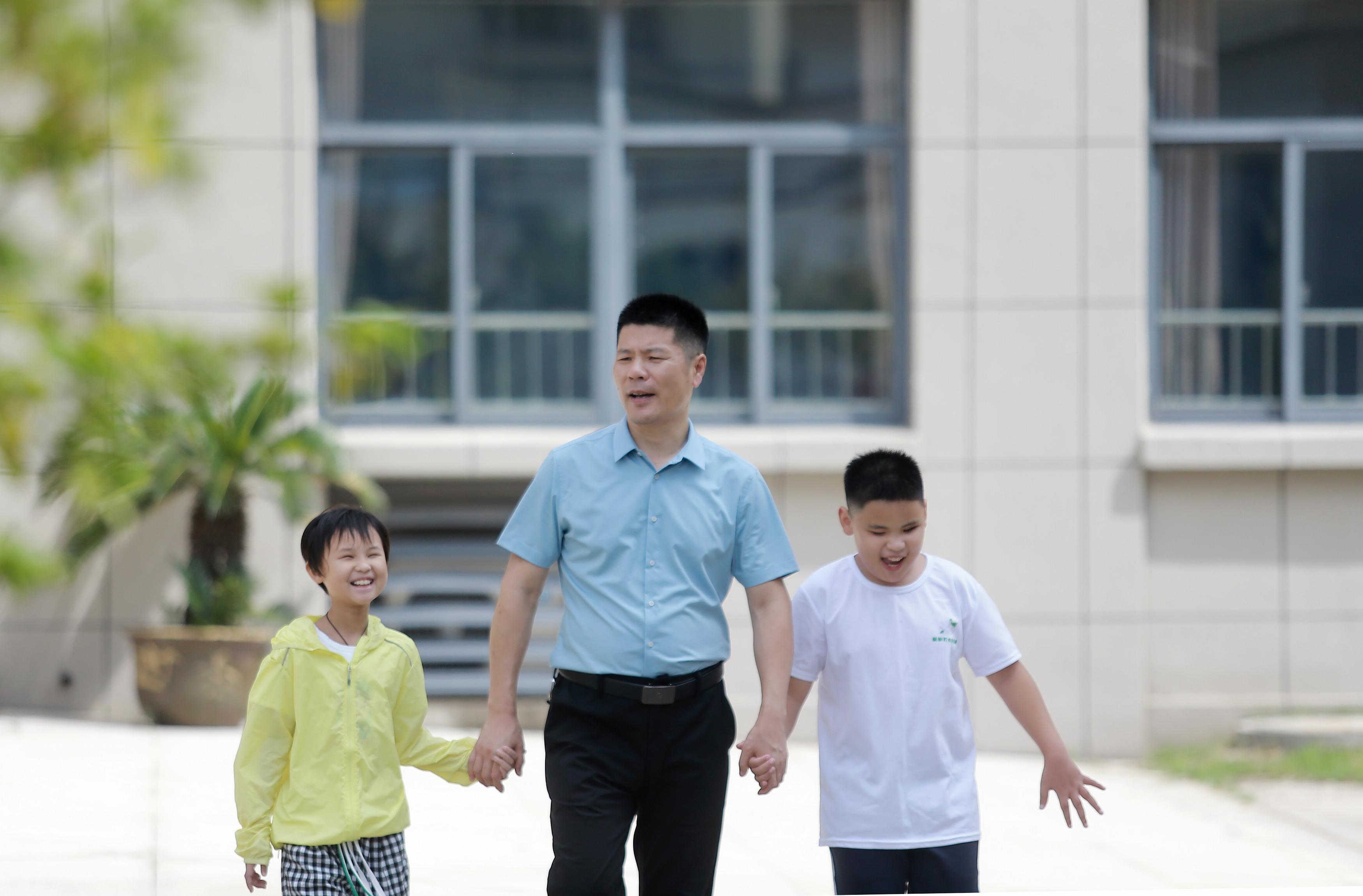 △2023年9月7日,江蘇省揚(yáng)州市特殊教育學(xué)校的孩子們和老師一起在校園里散步。