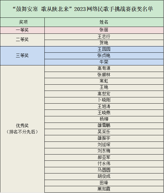 決賽現(xiàn)場(chǎng),參賽選手們依次上場(chǎng)深情獻(xiàn)唱,《一對(duì)對(duì)鴛鴦水上漂》《小桃紅》《走西口》等經(jīng)典的陜北民歌喚起在場(chǎng)群眾陣陣掌聲。最終,經(jīng)過一番精彩獻(xiàn)唱,專家評(píng)審團(tuán)現(xiàn)場(chǎng)打分決出“鼓舞安塞 歌從陜北來”2023網(wǎng)絡(luò)民歌手挑戰(zhàn)賽一、二、三等獎(jiǎng)獲獎(jiǎng)選手及優(yōu)秀選手。其中,張麗獲得一等獎(jiǎng),王志行、賀艷獲得二等獎(jiǎng),王園園、張貞艷、牛榮獲得三等獎(jiǎng),因4名民歌歌手棄權(quán)比賽,剩余20名民歌歌手均獲優(yōu)秀獎(jiǎng)。