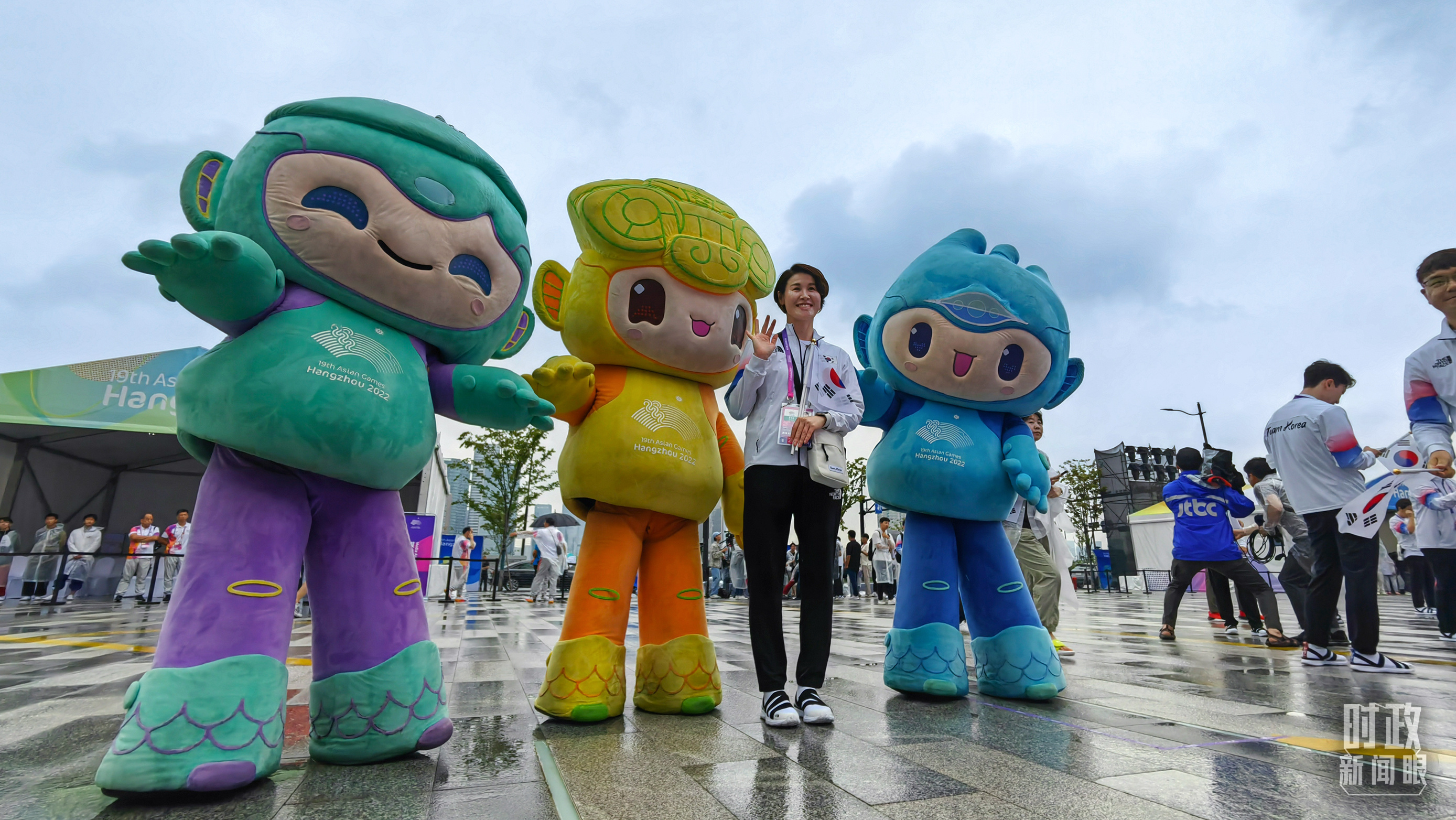 △亞運(yùn)村為各代表團(tuán)舉行歡迎儀式,隊(duì)員們紛紛與吉祥物“蓮蓮”、“琮琮”、“宸宸”合影。(總臺(tái)央視記者陳偉奎拍攝)
