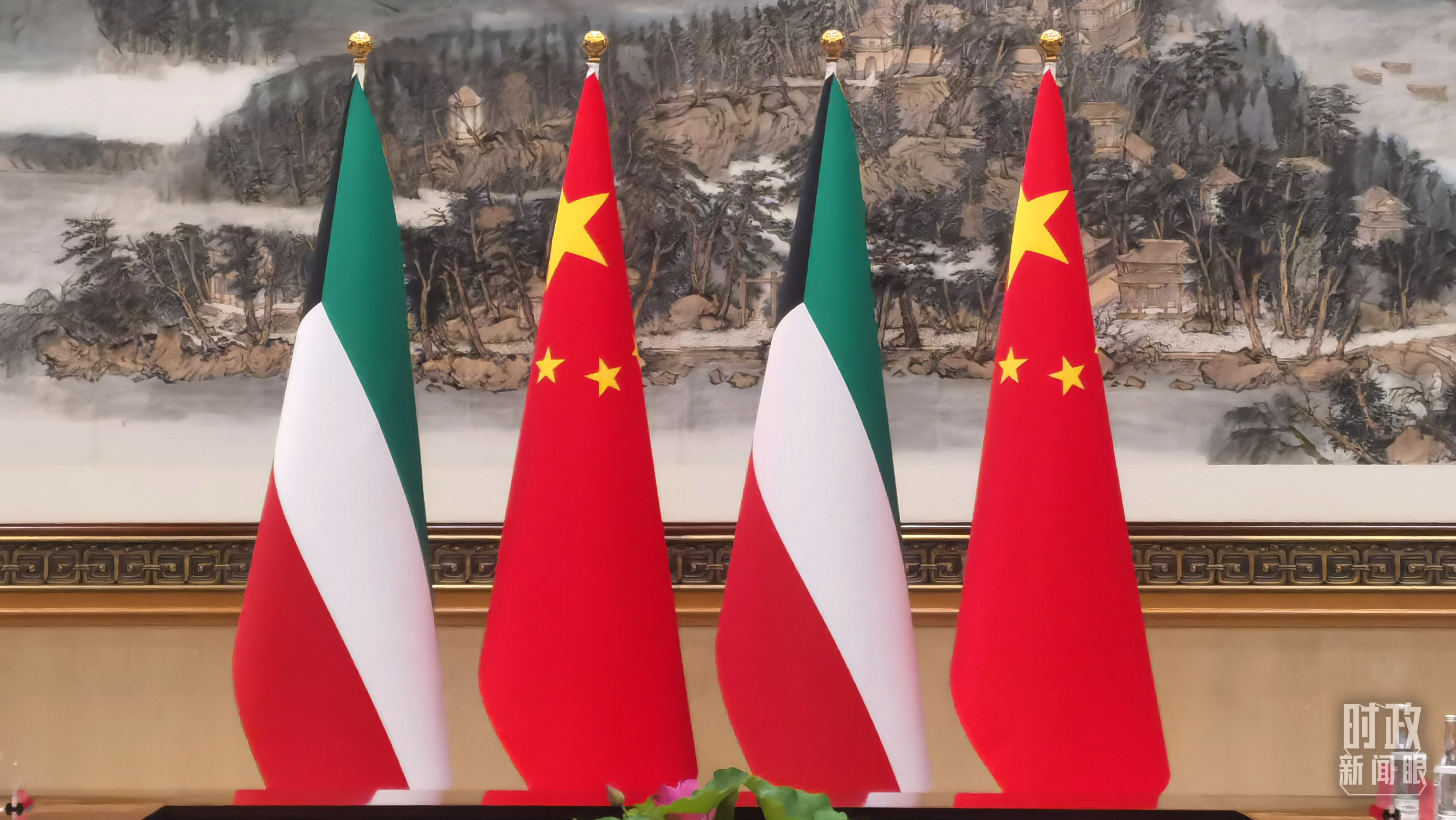 △會(huì)見現(xiàn)場(chǎng)擺放的中國(guó)、科威特國(guó)旗。(總臺(tái)央視記者曹亞星拍攝)